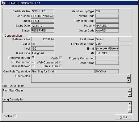 Reservation E-Cert. Selected if the E-Certificate can be consumed against reservations.