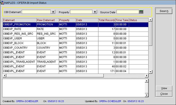 - From the OPERA BI Import Status screen, select the View button to view the status of the imported data.